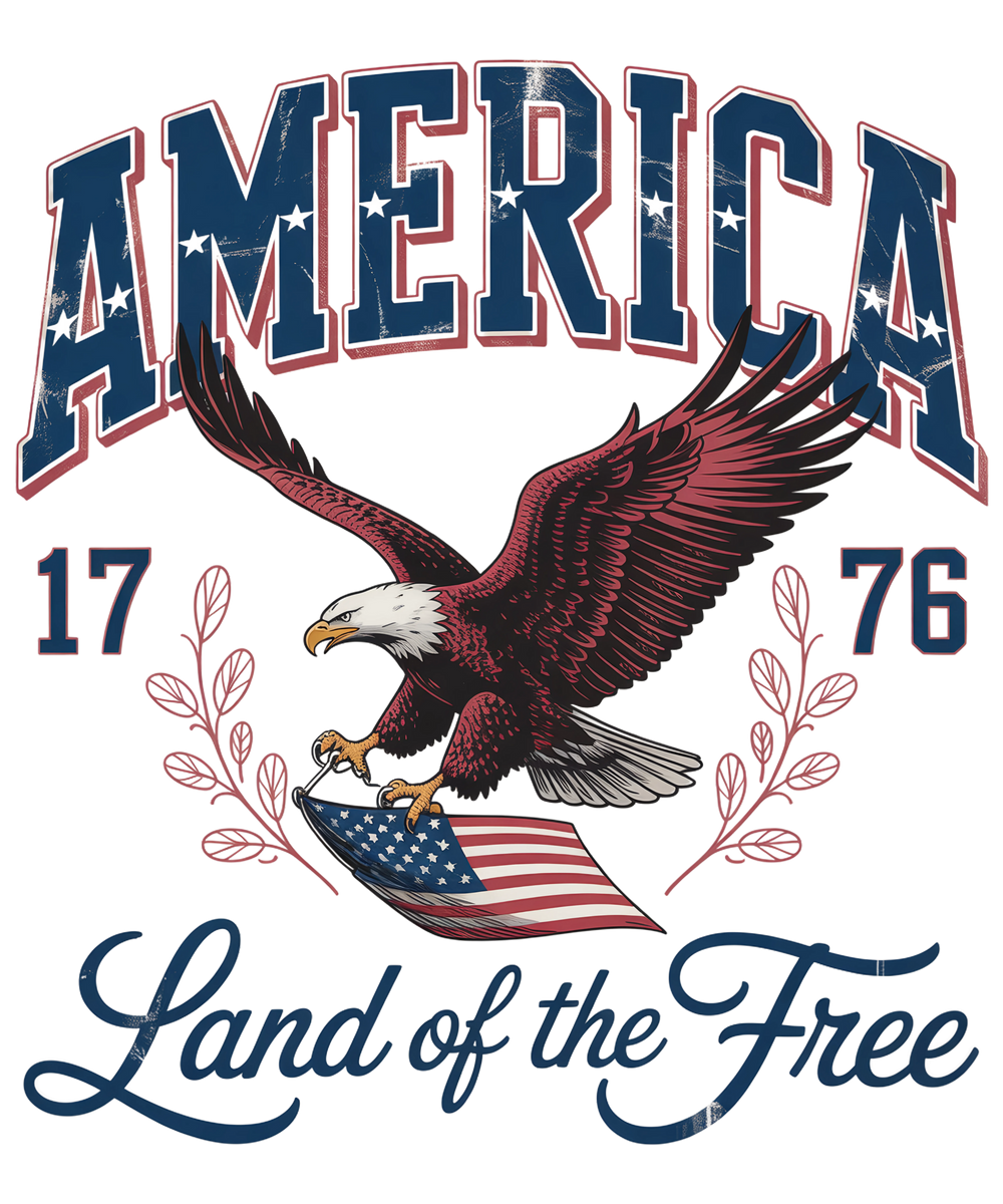 This premium patriotic design features a powerful American eagle combined with bold "America" typography and "Land of the Free" message. A perfect symbol of freedom, strength, and American pride.